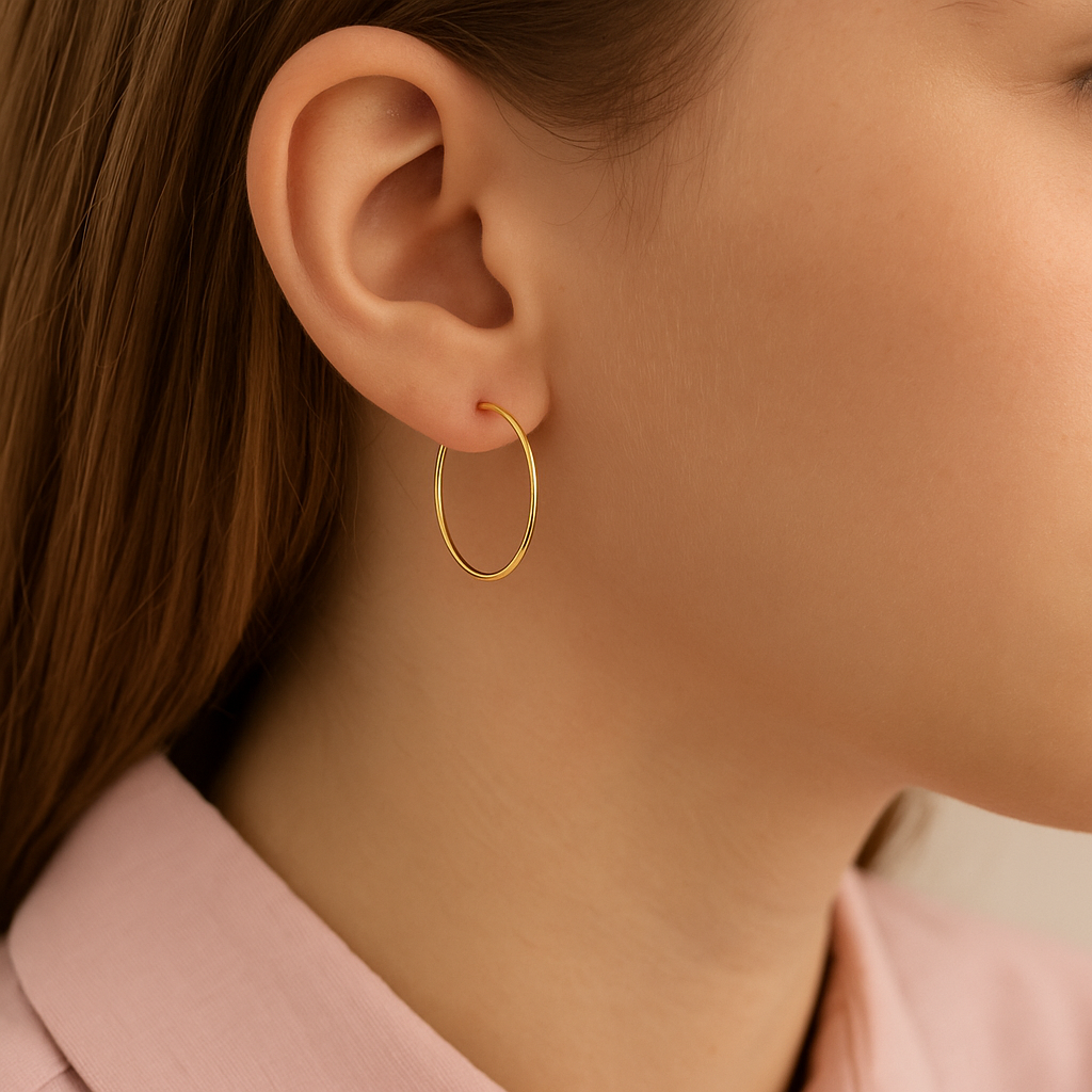 Aros ligeros de oro amarillo con diseño clásico y perfil muy fino. Un modelo versátil y elegante, ideal para uso diario o como regalo atemporal.