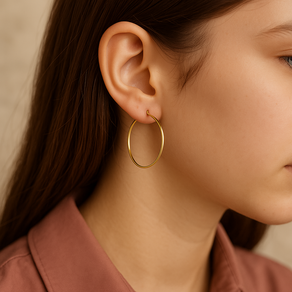 Aros grandes de oro amarillo con perfil fino y acabado pulido. Su ligereza y brillo natural los convierten en un clásico atemporal que realza cualquier look.