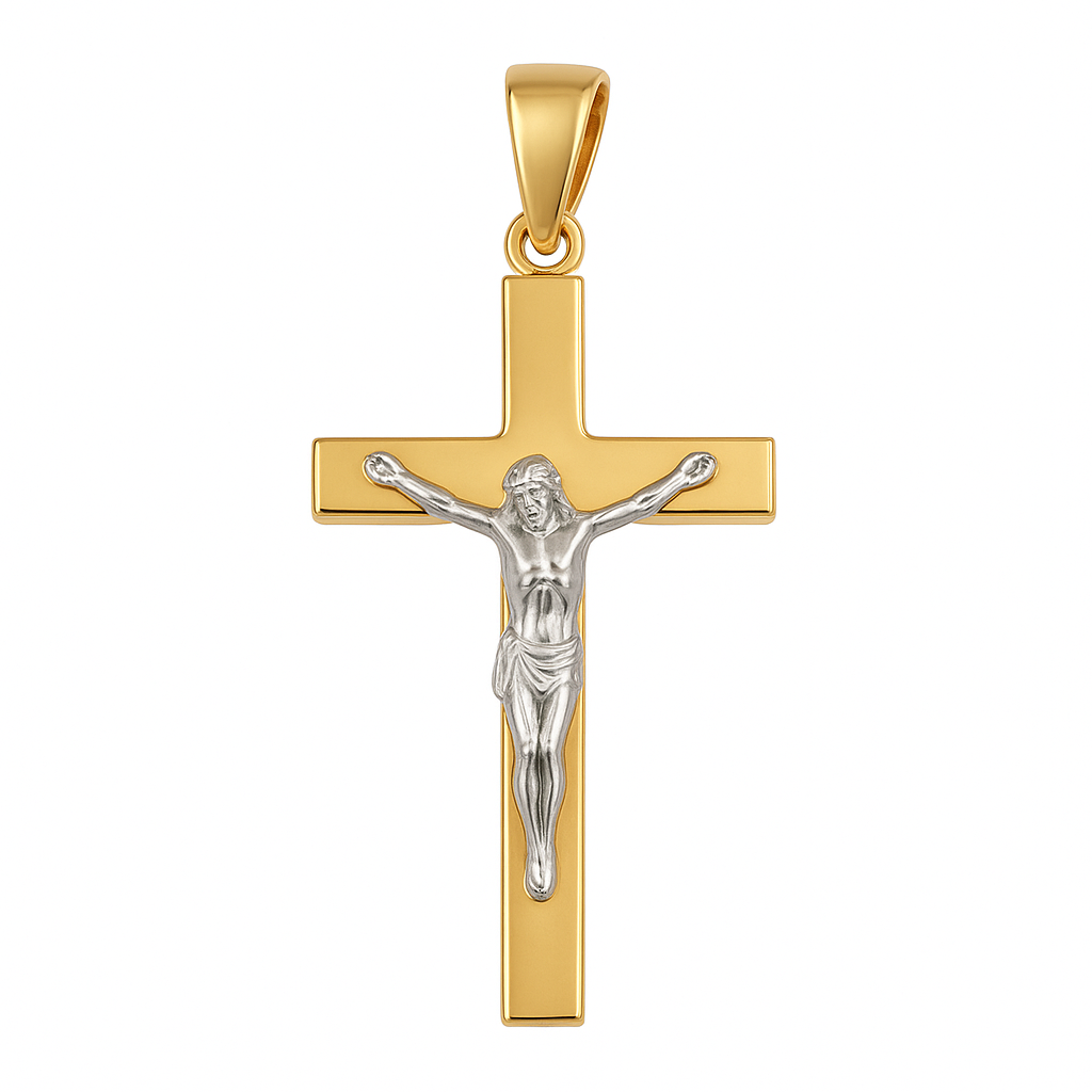 Colgante Crucifijo Bicolor, fabricada en Oro de Ley 375 mls (9 Kilates).